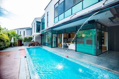 This private 4-bedroom, 4-bathroom pool villa offers the perfect blend of peace and comfort, making it the ideal getaway for families and friends. This villa offers 24/7 security, an on-site gym, a sauna, ample parking, plus: bike parking, concierge service, a doorman, a fitness center, package receiving, a resident lounge, secured entry, and a sparkling pool. Inside is equipped with a balcony, ceiling fans, modern appliances (dishwasher, garbage disposal, microwave, oven, refrigerator), a patio, and walk-in closets.