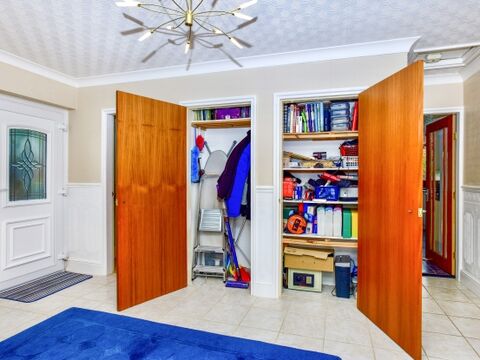 The bedroom accommodation is arranged to ensure comfort and privacy. The principal bedroom enjoys garden views and a full run of fitted wardrobes and overhead storage, while the two additional bedrooms, one double and one single, offer excellent flexibility, whether used as guest rooms, children's rooms or home offices.