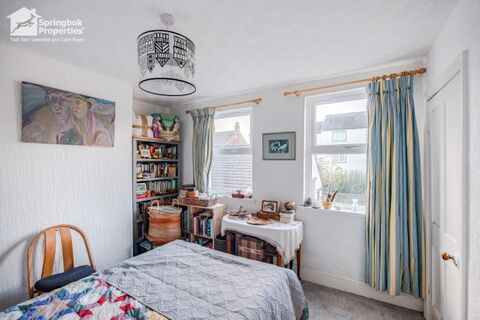 Upstairs, the property comprises two well-proportioned bedrooms, each providing a peaceful retreat. The bathroom is neatly laid out, fitted with a three-piece suite including a panelled bath with overhead shower, pedestal sink and WC.