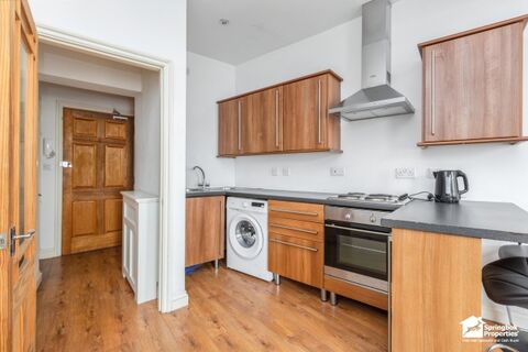 The open-plan layout features a well-designed kitchen fitted with wooden units, integrated oven and hob, and space for dining at the breakfast bar. The living area enjoys high ceilings and that fill the room with natural light, complemented by warm wood flooring throughout. A spacious double room provides a calm retreat, while the smart shower room and separate WC complete the accommodation.