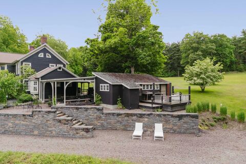 Welcome to Wolverton Creative Compound, a storied 119-acre estate set within a hidden valley offering complete seclusion, integrated creative workspaces, and timeless beauty. The original 1830s farmhouse is tucked away at the end of a private lane in Claverack, NY, where the road terminates in a round gravel driveway anchored by the property's original stone well. Two large ponds grace the land, including an aerated, swimmable pond directly in front of the house. Sited among meadows and mature woodlands, the main house, upgraded studio barn, and charming studio shed are framed by terraced stonework, a network of trails, and thoughtfully designed gardens. The setting is peaceful, restorative, and deeply connected to the land, yet only a short drive to both Hudson and Great Barrington.The antique farmhouse offers four bedrooms and two bathrooms across 2,825 square feet, where original details like moldings, wood floors, and Dutch doors preserve its old-world charm. A generous double li