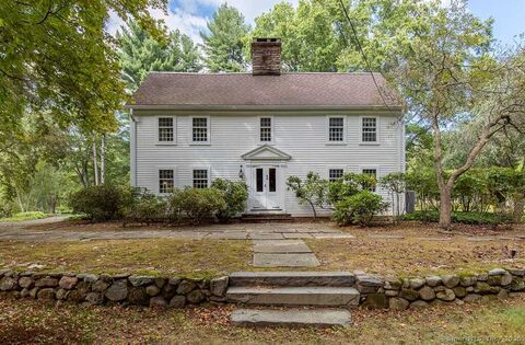 The Nathaniel Parks House circa 1706. Originally built in Guilford, CT, and painstakingly relocated to Woodbridge in 1934. This 5 Br, 3.5 bath, retains all of its original character, including wide plank floors, hand-hewn beams, and a striking double-leaf entry framed by fluted pillars and a pedimented gable. Thoughtful rear additions, including a gambrel wing with garage, were added during the move. Barn-style garage doors and a welcoming covered breezeway connect the main home to an additional wing. Inside, a fieldstone fireplace serves as the stunning focal point of the living area, complemented by exposed wooden beams that enhance the home's historic charm. The eat-in kitchen opens to a sunlit family room with soaring ceilings, four oversized skylights, and panoramic views overlooking the serene backyard. The primary suite features a full bath with a whirlpool jetted tub. Step outside to a brick patio overlooking 7.7 tranquil acres and a classic barn-perfect for storage. The proper