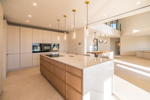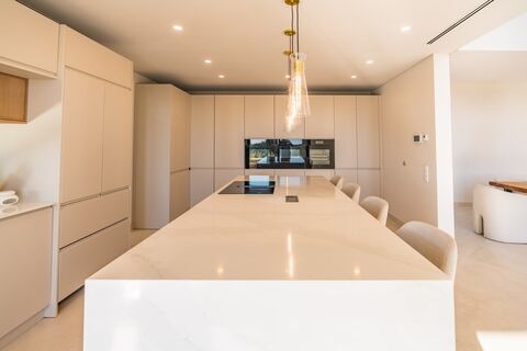 Interior designed for comfort throughout the year, the property features underfloor heating and cooling systems, supported by ducted air conditioning. The ground floor offers a spacious open-plan layout that seamlessly connects the living, dining, and fully equipped designer kitchen. Large, floor-to-ceiling windows flood the space with natural light and open directly onto a vast terrace, perfect for outdoor dining, sunbathing, or relaxing while enjoying the sea views.