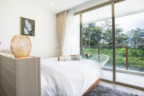 🔹Bedroom with direct access to a private balcony with serene greenery, and partial sea views.