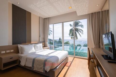 The open-plan living space is elegantly designed in a Thai-resort style, with a spacious living room, dining area, and a fully equipped Western kitchen. The bedroom is a serene retreat, complete with a walk-in glass shower, wooden floors, built-in wardrobes, and a desk. A large glass door opens onto the private terrace, allowing natural light to flood the room. Positioned on the top floor, this penthouse offers fresh air and breathtaking views of Klong Muang Beach. It is equipped with a TV and Wi-Fi.
