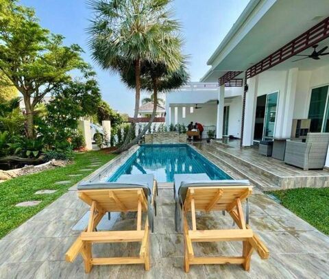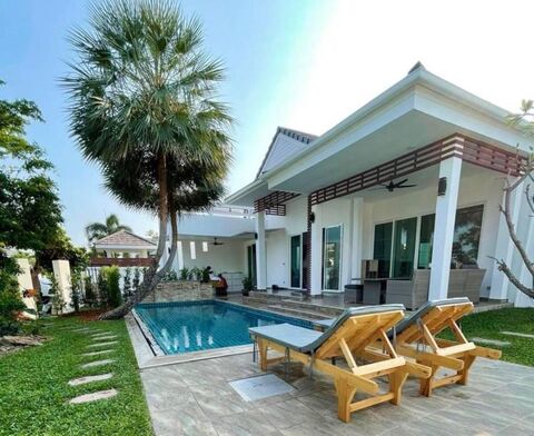 Introducing a charming 3 bedroom, 2 bathroom villa with a private pool at Sivana Gardens. This villa is situated on Soi 126, just a quick 10 minute drive from Hua Hin town and its beautiful beach. The villa offers spacious living with 255 sqm of built-in space, including 136 sqm of comfortable living area. It sits on a generous 521.6 sqm of land. Inside, you'll find an open-plan living and kitchen area, a convenient laundry room, and a dedicated parking space for one car. One of the highlights is the 3x9 saltwater pool, perfect for relaxation, and a rooftop area that provides stunning views of the mountains and the pool. As part of the Sivana Gardens community, you'll have access to fantastic amenities, including a clubhouse, a popular restaurant, and a fitness center. Plus, right across the road is the newly relocated Mozza Mia Restaurant, managed by the Sivana Team. Don't miss the chance to see this wonderful villa in person. Contact us today to schedule a viewing!