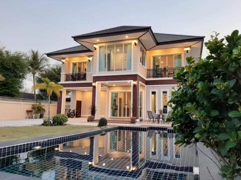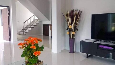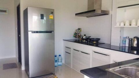 This freestanding house is 240 sqm. large and set on land area of 764 sqm. Ground floor features huge open plan living area, dinning area and also leads to fitted kitchen with proper countertops. On second floor you have 4 bedrooms, 3 baths as well as covered balcony overlooking green view. Private saltwater pool is 4x8m position in the front of the house. There is a big green space at the rear of the house which is possible to build more guest house. The house is sold furnished and ready to move in. Located close to Black mountain and only 10 km. from Hua Hin town.