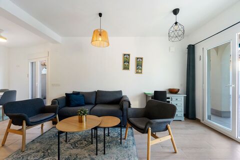 Modern and bright villa with spacious plot, three bedrooms, three bathrooms and private pool only 100 m from the Mediterranean Sea.