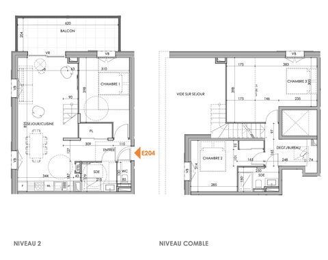 This apartment (E204) is located on the 2nd and third floors. It is 86.06m2 plus a further 6.95m2 in bedroom 3 that is below 1.8m in height. The apartment includes an entrance, open plan living/kitchen/dining room with balcony, bedroom 1, bathroom and a separate WC on the lower level, above there are 2 further bedrooms, a small study area, and bathroom with WC. The apartment benefits from high ceilings. There is a North-West facing balcony that is 12.69m2.