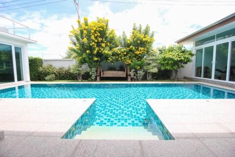 Mali Residence is a secure and well maintained delvelopment located in Hua Hin Soi 112, about 10 min to downtown Hua Hin and shopping malls. The development is offering friendly surrounding as well as stunning mountain view. This villa features 5 bedrooms 6 bathrooms with spacious outdoor and indoor open plan living area. The villa features 2 kitchen with all built-in appliances which convenient for both Thai and European cooking. Additionally, the villa also has rooftop terrace with seating area overlooking peaceful and green surrounding. Outside is a private 11x4 m overflow saltwater pool and double carpark with eletric gate. The villa is sold fully furnished as shown in pictures.