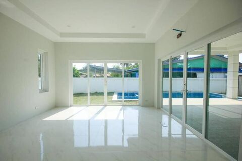 This 310 sq. meter large Pool Villa at 'Palm Gate' is waithing for your personal touch to complete.The location is just 10 min away from Hua Hin town and beautiful beach. The project has common facilities as basket ball court and garden. Property features; 3 Bedrooms 3 Baths Kitchen 42 sq.meter large covered poolside terrace 10 x 4 m pool Jacuzzi 1.80x1.80 m Large store and utility area behind the kitchen Outdoor toilet and pumproom 2 covered carpark Garden area Property details: Celing hight from 3,2 - 3,4 meters 15 cm insulation in the ceiling 20 cm blocks for house construction Contact us for more information. Optional to complete the villa buy yourself with a price reduction. Monthly fees: 3.75 baht/ sqm. Ownership: Freehold Built year: 2019