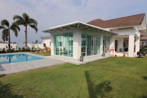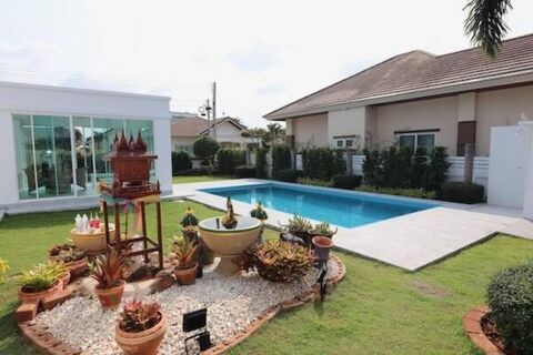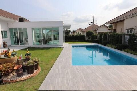 Wararom Village is a Swedish owned project in Khao Tao with beautiful views and surroundings. It is just 5 minutes to two beautiful beaches, and only 15-20 minutes drive to the town of Hua Hin. This pool villa is totally renovated inside out and has 3 bedrooms with 2 bathrooms and a maids quarter with en suite bathroom. The plot is 600 sq/m allowing plenty of space. The house has an 8m x 4 m swimming pool with an integrated jacuzzi feature. All bathrooms are new or tastefully renovated to a very high standard. As an example of the level of renovation, the electricity system is upgraded to 3-phase. A new fully equipped modern kitchen and dining area as well as a comfortable seating area are all situated within the main open plan area of the house. The site has a 24 hour security guard, a common garden area and a large swimming pool and bathing terrace. A glass veranda with foldable doors leads to the garden and the pool area. At the back of the house in close proximity to the maids quarter is a fully equipped outdoor thai style kitchen This attractive village is surrounded by pineapple fields and enjoys panoramic views across towards the mountains of Sam Roi Yod. The elevated position of the development ensures a welcome breeze in the late afternoons. Pranburi is just 12 minutes by car and Hua Hin town centre only 15 kilometers. The beautiful beach cove of Sai Noi is a few minutes away. Milford golf course less than 4kms. A very nice and tastefully renovated pool villa. Viewings are highly recommended.