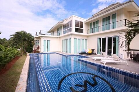 This luxury 2 story 4 bedroom private pool villa is situated on one of the best golf courses in Thailand - Black Mountain Golf Club. This is an excellent property as an investment, family home, golf course getaway or rental property. The villa consists of 1 bedroom downstairs and 3 bedrooms upstairs, 5 bathrooms overall and 700 square meters of living space on a land plot of 680 square meters. You have a built in high quality BBQ facing the golf course and swimming pool. The ground floor is spacious with high ceilings and all open plan, with a great European kitchen and central kitchen island that's perfect for family breakfasts. The home has more than enough storage space, and the fold-in sliding doors open up onto the large private pool villa to create a beautiful indoor - outdoor living area where you will love spending time with family and friends. There is a central spiral staircase leading to the second floor, which has a lot of space for multiple guests. The home also features a 2nd floor outdoor terrace / balcony which has some stunning views of Black Mountain Golf Club's country club and the 18th hole which is directly in front of this villa across the waterhole. Contact us today for a private house tour.