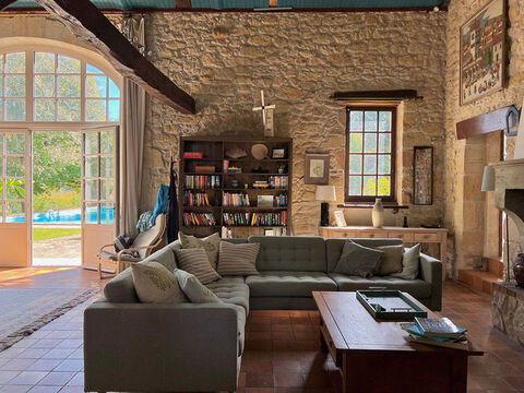 3-bed stone house & 1-bed gite has a double-height living room, mezzanine area and potential to extend. In the 1 acre garden there is a covered terrace with fireplace and 12 x 6 m pool. Set in a rural setting with open views yet just 5 mins from the market town of Monsegur.