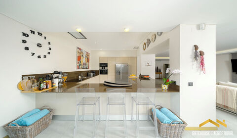 This renovated detached 287 m2 villa, set on a 1,487 m2 plot, features an entrance hall, an open-plan living room with fireplace, dining area and a fitted and equipped kitchen with Bosch appliances and breakfast bar, three en-suite bedrooms, a guest cloakroom, all on the ground-floor and the first-floor is reserved for the principal suite, an office area, private saltwater heated swimming pool, terraces, an integrated gas barbecue, Al Fresco dining areas, roof terrace, private parking spaceand landscaped gardens Layout Entrance hall, cloakroom Open-plan living and dining area with fireplace Fully fitted kitchen with Bosch appliances and breakfast bar Four bedrooms and four bathrooms Office space Outside Private heated saltwater pool Terraces, Al Fresco dining area, balcony BBQ zone Parking space, gardens Location Located within a 5-minute stroll from the iconic Quinta do Lago boardwalk, which meanders along the edge of the Ria Formosa Nature Reserve, and moments from the golden sands of Ancao Beach, At a glance Two-storey 287 m2 build, 1,487 m2 plot Renovated in 2016 Four bedrooms, four bathrooms, cloakroom Pool, terraces, Al fresco dining, BBQ * Parking, gardens