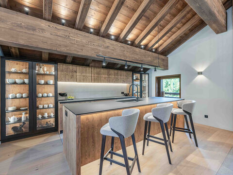 The chalet boasts five en-suite bedrooms, including a children's dormitory, offering ample space for family or guests. Additional features include a gym, and a wellness area with a hammam, sauna, and shower, perfect for unwinding after a day on the slopes.