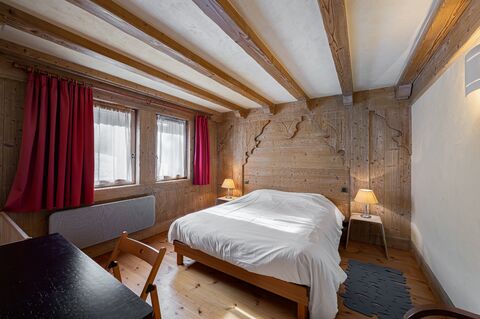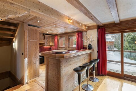 The chalet welcomes you with a warm and spacious living area, centred around a traditional fireplace, creating the perfect setting for relaxed evenings after a day on the slopes. Large openings lead to a balcony and terrace, allowing you to enjoy sunlight throughout the day and views over the surrounding alpine landscape. The fully equipped kitchen is designed for convivial moments, whether hosting dinners or enjoying quiet mornings.