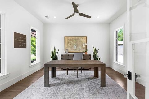 Immaculate and move-in ready, this one-owner 2016 custom home by Justin Jeffrey Homes offers 6,103 square feet of refined living in coveted Preston Club Estates. Behind a motorized entry gate and gated front courtyard, discover a sophisticated 5-bedroom, 7 bath contemporary masterpiece where design and functionality meet at every turn. A custom glass iron front door opens to expansive living spaces featuring two gas fireplaces, a separate office with glass French doors, and designer lighting and hardware throughout. The chefs kitchen is fully equipped with a 48 Wolf range, Gaggenau stainless steel refrigerator, two Bosch dishwashers, quartz countertops, under-cabinet lighting, and a walk-in pantryideal for both entertaining and everyday living. A stylish butlers pantry and a dramatic glass-enclosed, backlit wine wall with built-in wine fridge complete the heart of the home. The primary suite overlooks the resort-style backyard and includes a spa-inspired bath with soaking tub, larg