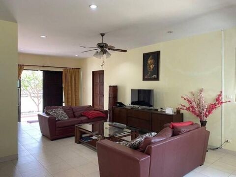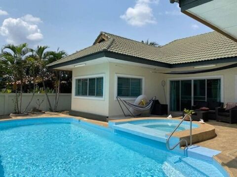 The villa features a very spacious open plan living, dining and kitchen, 3 bedrooms and 3 bathrooms. Outside is a good sized terrace beside the pool, gardens all around the villa and covered car parking. The Villa is within a small Development of Villas with no communal fees that is located next to Khao Tao Royal lake and 2 mins drive to the Beach and within walking distance to local cafes and restaurants. The villa is both for rent and for sale. Rental fee depends of time on year and length of stay, please contact us for a quote for your dates.