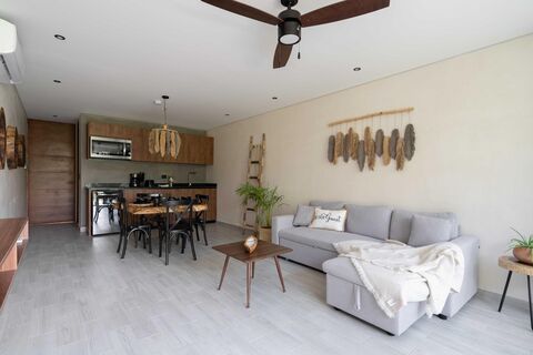 Live the magic of Tulum in this apartment designed for absolute comfort and privacy. The interior features an intelligently designed and elegantly furnished space, with a bedroom featuring a full bathroom and a functional kitchen integrated into a bright environment. The heart of this property is its private terrace, an outdoor space that is an extension of your living area where you can relax, enjoy dinners under the stars, or simply contemplate the unique atmosphere of Tulum. It is the perfect retreat for one or two people seeking the extraordinary.