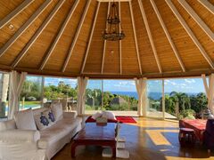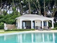 The master suite on the ground floor is expansive and breezy. A striking master bath and generous closets round out the picture. Extra-tall windows admit light and cooling trade winds. Views across lush meadows enhance the privacy of this special space within the villa.