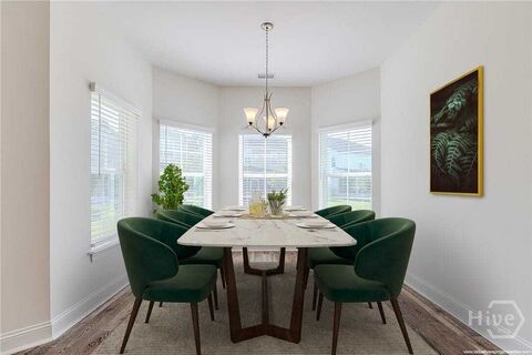 New Price! Welcome to this beautifully maintained Camden II ranch-style home in the Davenport neighborhood of Savannah Quarters, offering ultra-high energy efficiency with fully owned solar panels. The open-concept layout features a gourmet kitchen with quartz countertops, stainless steel appliances, a vented cooktop, wall oven/microwave combo, and a spacious island with breakfast bar. Enjoy meals in the sunlit breakfast nook or formal dining area with serene lagoon views. The primary suite includes a large bedroom, walk-in closet, and spa-like bath with soaking tub, double vanity, and separate shower. Two guest bedrooms and a full bath are privately situated. Relax on the covered patio with stacking glass doors, perfect for indoor/outdoor living. Freshly painted garage floor. Optional Savannah Quarters membership offers resort-style amenities: pool, tennis, fitness center, and clubhouse