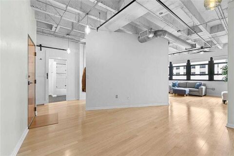 Live in the heart of the city at Peachtree Lofts. This bright one bedroom loft features 12 foot exposed ceilings, hardwood floors throughout, and an open, flexible layout with no load bearing walls, offering endless options to customize the space. A versatile entry area is perfect for a home office, dining area, or additional living space. An entire wall of windows with shades fills the home with natural light. The open kitchen overlooks the living area and features white cabinetry with black uppers, quartz and butcher block countertops, stainless steel appliances, and a spacious pantry. The bedroom area offers room for a king size bed and can be curtained off for privacy. The bathroom includes a bright white vanity, custom cabinetry, and a modern shower. Custom California Closets sit conveniently next to the in unit washer and dryer. Building amenities include 24/7 concierge, fitness center, saltwater pool, resident lounges, large dog park, and a whole building generator. Walk Score 9