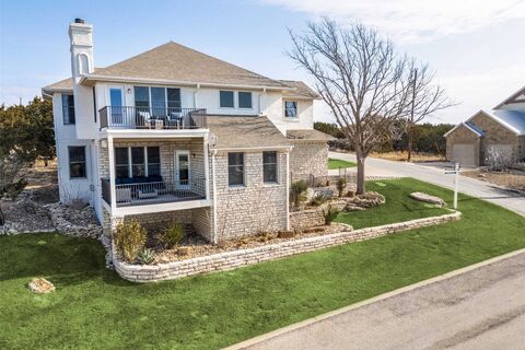 Exceptional two lot estate property with transferable boat slip boat slip, a truly rare find. Experience refined lake-country living in this exquisitely updated residence located within the prestigious, gated Cliffs Resort on Possum Kingdom Lake. Offering stunning lake views and an exceptional blend of luxury, comfort, and resort-style amenities, this furnished home is a rare turnkey opportunity. The thoughtfully designed floor plan features three bedrooms, two and a half bathrooms, and two spacious living areas, ideal for both everyday living and elevated entertaining. A large eat-in kitchen anchors the home, offering ample countertop space and an inviting layout perfect for gatherings, while expansive windows capture breathtaking lake vistas throughout the living spaces. Recent enhancements include fresh exterior and interior paint, rich hardwood flooring creating a seamless, upscale aesthetic throughout. The primary suite is a true retreat, highlighted by a completely remodeled, spa