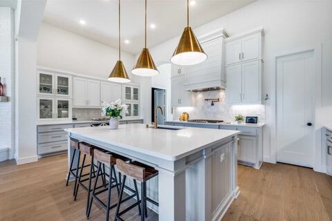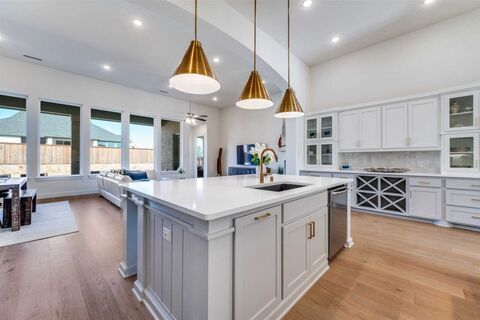 Welcome to this beautifully upgraded one-story Highland Home in the highly sought-after Cambridge Crossing community. Designed with a desirable three-way bedroom split, this home offers privacy and flexibility, complemented by a dedicated study a bright, open floor plan filled with natural light. The inviting family room features walls of windows with views of the private backyard and flows seamlessly into the chefs kitchen. Here, youll find a gas cooktop with pot filler, double ovens, a buffet area, and abundant cabinetryperfect for both everyday living and entertaining. The spacious primary suite is a true retreat, complete with a cozy sitting area and a luxurious spa-like bath with a sit-down vanity. A media room and versatile flex room provide endless possibilities for entertaining. Additional highlights include a three-car garage, designer lighting, hardwood floors, and custom finishes, and a south-facing orientation. Ideally located just minutes from the Dallas North Tollway,