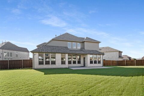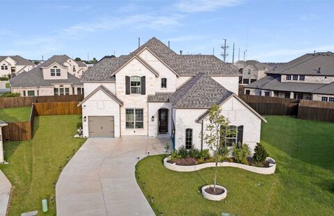 Huge pie shaped lot in the beautiful Woodbridge community of Wylie. Just around the corner from shopping, dining, grocery, and FM 544. Step inside to a bright and welcoming interior featuring soaring ceilings in the foyer and living room, engineered wood flooring, and a thoughtfully designed layout. The main level offers two bedrooms and two full bathrooms, including a luxurious primary suite complete with a soaking tub, large walk-in glass shower, and a spacious closet. The gourmet kitchen has beautiful granite countertops, a white farm sink, stainless steel appliances including a convection microwave and oven, a 36 gas cooktop, and a large walk-in pantry. Upstairs, youll find two additional bedrooms, a spacious game room, and a dedicated media room perfect for movie nights, entertaining, or relaxing. Enjoy outdoor living with a large covered patio, extended concrete pad, and lush backyard, ideal for cooking out, unwinding, or playing. Additional upgrades include JellyFish lighting