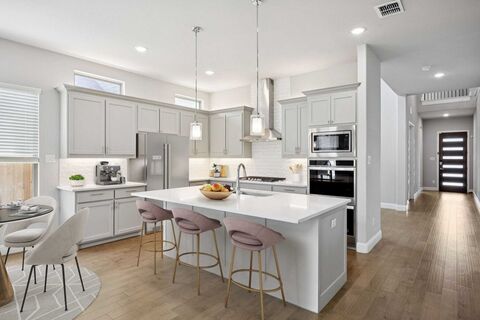 This stunning modern 5-bedroom home is an architectural marvel, offering a spacious open floor plan designed to maximize natural light and seamless living. Upon entry, you're welcomed by soaring ceilings that create an airy, expansive atmosphere. Oversized windows in the living room flood the space with sunlight and frame a sleek, contemporary fireplaceperfect for both relaxation and entertaining. The homes neutral wall tones provide a versatile backdrop, ready to complement any style of dcor. A smooth flow from the living area into the breakfast room creates an ideal layout for gatherings, with ample space for a large dining table. The gourmet kitchen features stainless steel appliances, an expansive quartz island with bar seating, and an abundance of modern cabinetry that offers both style and practical storage. A generous walk-in pantry keeps everything organized and within reach.The main-level guest bedroom is thoughtfully designed w-comfort in mind and offers views of the gre