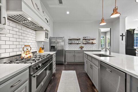 NO HOA! Tucked away on a quiet cul-de-sac near the shores of Lake Ray Hubbard, this stunning 5 bedroom, 6 bath located in The Pinnacle offers resort-style living and endless flexibility. The open-concept kitchen, dining, and living area features expansive windows that flood the space with natural light and capture tranquil backyard views and relaxation vibes! Downstairs, youll find primary bedroom, laundry room, built in workstation and three versatile flex roomsperfect for a home office, gym, craft room, or additional guest spacegiving you the freedom to tailor the home to your lifestyle. Upstairs, discover three spacious bedrooms, each with its own charm, plus a large game room or family room area with built in entertainment center that provides extra space for playing your favorite game, watching a movie or having fun. Lake views offer a view of downtown Dallas, from the upstairs family room. Step outside to your private backyard oasis, complete with a sparkling pool with cas