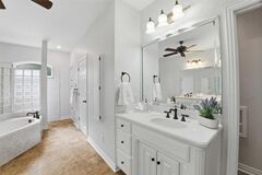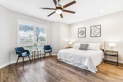 Perfectly positioned on the fairway in the highly sought-after Plantation Resort community, this beautifully updated 4-bedroom, 2.5-bath home delivers golf course views, thoughtful renovations, and a flexible floor plan designed for todays lifestyle in Frisco.The reimagined main level features an open-concept layout that seamlessly connects the living, dining, and kitchen spacesideal for everyday living and entertaining. The fully renovated kitchen is a true centerpiece, showcasing custom Canadian solid cherry cabinetry, a premium Italian Fulgor Milano 36 gas range, U.S.-made Cambrian quartz countertops, and the added convenience of a second walk-in pantry. Durable, wood-look rectified porcelain tile flooring extends throughout the first floor, combining elegance with low-maintenance living.The first-floor primary suite offers a private retreat with a completely remodeled ensuite (June 2025), featuring updated flooring, a double vanity, and a spacious frameless glass walk-in