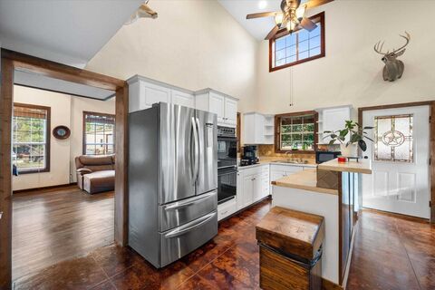Welcome to this beautifully unique 2-bedroom, 2.5-bath barndomium that offers space, comfort, and versatility just minutes from the lake! Perfectly suited for those who love a blend of rustic charm and modern amenities, this property has it all. Inside, you'll find rich pine floors throughout and a welcoming gas and wood-burning fireplace as the centerpiece of the living room. An elegant winding staircase leads to a loft-style upstairs bedroom and full bath, overlooking the living area ideal for guests, teens, or a private retreat. The primary suite boasts his and hers walk-in closets and a spacious en-suite bath. Each bedroom is generously sized, and all bathrooms are thoughtfully designed for comfort and functionality. Step outside to enjoy the covered front porch, perfect for relaxing year-round. Cool off in the above ground pool and take advantage of the electric gate for added privacy and security. Equestrian or hobby farm ready, the property includes a walking pen approved fo