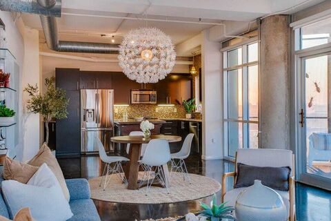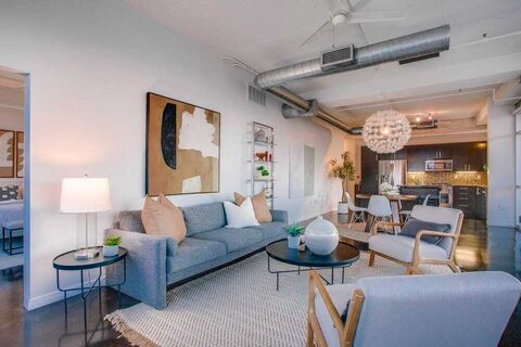 Wake up with the city and wind down with it from this rare, designer-owned corner residence at Beat Lofts. With nearly 270 degrees of uninterrupted skyline views, the home feels wrapped in Dallaslight shifting throughout the day, buildings glowing at dusk, and the city quietly moving below. Inside, the loft stays true to its industrial roots with 10-foot ceilings, polished concrete floors, and floor-to-ceiling glass that keeps the skyline present from almost every room. The living and dining areas feel expansive yet comfortable, with the view acting as a constant backdropwhether hosting friends or settling in for a quiet night. The kitchen blends style and function with granite countertops, stainless steel appliances, a five-burner Forno gas range with French doors, a Bosch dishwasher, and a smart pull-out pantry. A tucked-away workspace with sliding doors and Elfa shelving lets you close things up and fully leave work behind. The secondary bedroom offers flexibility as a guest suite