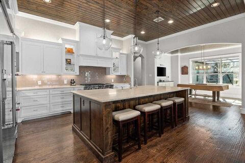 Located in the exclusive, guarded and gated community of Bella Flora and within coveted Aledo ISD, this stunning 4-bedroom former John Askew model showcases exceptional upgrades and thoughtful design at every turn.Filled with natural light and anchored by rich hand-scraped wood floors, the expansive open floor plan offers effortless flow for both everyday living and entertaining. At the heart of the home, the chefs kitchen impresses with a honed quartz island, butlers pantry, oversized walk-in pantry with custom built-ins, and wine cooler perfectly designed for gathering and hosting.A private office provides an ideal work-from-home retreat, while a versatile bonus room with an attached bath and outdoor access offers flexible space for guests, hobbies, or poolside entertaining.The spacious primary suite is a true sanctuary, complete with a coffee bar, spa-inspired bath, and generous walk-in closet.Designed for year-round enjoyment, the approximately 850-sq-ft air-conditioned