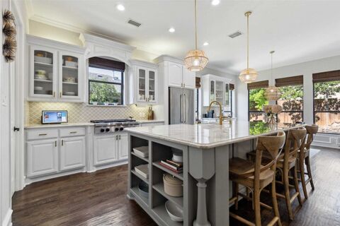Designed for modern living and effortless entertaining, this updated Stonelake Estates home offers exceptional space and flexibility. With 6 bedrooms, 4 full bathrooms, two living areas, a private home office, and a dedicated media room, this home is ideal for multi-generational living, remote work, and entertaining.Unlike many homes in the neighborhood, this property has been comprehensively renovated with todays buyers in mind. The chefs kitchen features a large center island, modern cabinetry, upgraded appliances, and designer finishes, while all bathrooms have been fully updated to current luxury standards. The primary suite showcases vaulted ceilings, a spa-inspired bath with a freestanding soaking tub, dual vanities, and a custom walk-in closet with built-ins.Throughout the home, hand-scraped hardwood floors, abundant natural light, and a functional open layout create a refined yet inviting atmosphere. Multiple flexible living spaces provide options for family living, g