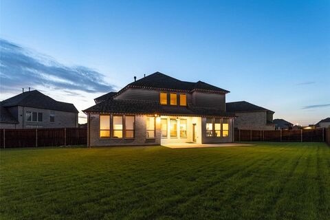 Huge pie shaped lot in the beautiful Woodbridge community of Wylie. Just around the corner from shopping, dining, grocery, and FM 544. Step inside to a bright and welcoming interior featuring soaring ceilings in the foyer and living room, engineered wood flooring, and a thoughtfully designed layout. The main level offers two bedrooms and two full bathrooms, including a luxurious primary suite complete with a soaking tub, large walk-in glass shower, and a spacious closet. The gourmet kitchen has beautiful granite countertops, a white farm sink, stainless steel appliances including a convection microwave and oven, a 36 gas cooktop, and a large walk-in pantry. Upstairs, youll find two additional bedrooms, a spacious game room, and a dedicated media room perfect for movie nights, entertaining, or relaxing. Enjoy outdoor living with a large covered patio, extended concrete pad, and lush backyard, ideal for cooking out, unwinding, or playing. Additional upgrades include JellyFish lighting