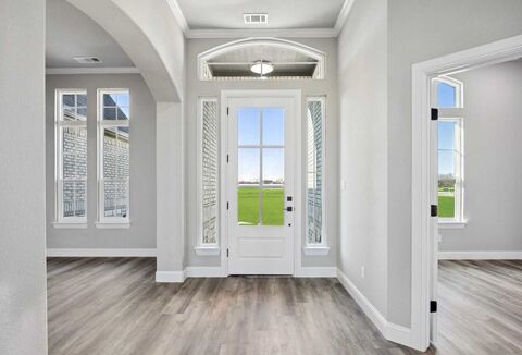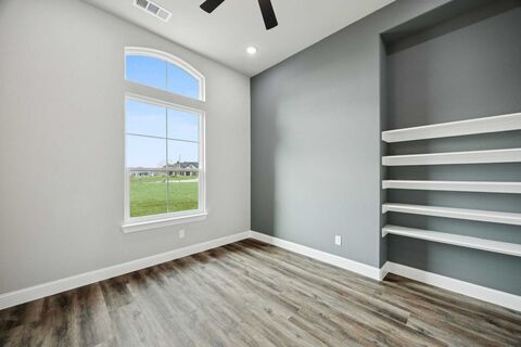 NEW CONSTRUCTION! Experience modern luxury and thoughtful design in this stunning new build on a 1-acre lot. This 3-bedroom, 3-bath home features a dedicated office, tech room, and an open floor plan. The exterior boasts Capstone King Size brick, white limestone accents, black-finished vinyl windows, LED lighting, and Onyx Black shingles. A black garage door with smoked glass, sprinkler system, Magnolia tree, and Crepe Myrtles add timeless curb appeal. Inside, Repose Gray walls, white trim, quartz countertops, and Luxury Vinyl Plank floors create a clean, cohesive look throughout. The spacious family room includes a 5-ft linear electric fireplace, accent wall, 84 ceiling fan, crown molding, and a beverage nook with mini fridge. The gourmet kitchen offers a large island with seating, marble backsplash, quartz counters, bar area, double ovens with microwave, stainless steel Whirlpool appliances, and 36 built-in 5-burner cooktop with pot drawers. The primary suite features a recessed ce