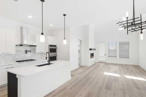 Ready Now! Feel like a Royal in our Alexander floor plan. Step into the epitome of modern living with this brand-new Monarch Home, where architectural sophistication blends seamlessly with everyday comfort. This 4-bedroom, 3.5-bath masterpiece includes a spacious game room and a functional pocket office, offering versatility for both entertainment and work-from-home lifestyles. Designed for discerning tastes, the home boasts premium finishes throughout. The Chef-Inspired Kitchen is outfitted with a JennAir appliance package, including double ovens and a 5-burner gas cooktop, making it a culinary dream. Enjoy the elegant touch of quartz countertops, a pot filler, Blanco Silgranit sink, and soft-close cabinetry with upgraded hardware. A decorative backsplash adds a sleek, modern flair. Gather around the crystal-accented gas fireplace under the ambient glow of luxury Kichler lighting. The Karastan Cultivated wood flooring in common areas downstairs as well primary bedroom, combined with 8