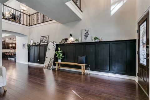 Welcome home! Located in one of the most sought-after areas of the Metroplex, this home offers over 3,300 square feet (3,338 per Denton CAD) of wonderful living space. The versatile floor plan provides multiple options for living and dining areas, with an open, seamless flow thats perfect for entertaining. Generous room sizes and abundant storage make this home both beautiful and functional. The first living area, currently used as a home office-library, features a wall of built-in bookshelves that remain with the property. It can easily serve as a formal living or dining room, playroom, or flex space to fit your needs. Hardwood floors flow into the open-concept family room and kitchenthe heart of the home! The kitchen features warm, rich cabinetry, granite countertops, and ample prep and storage space, all completely open to the family room with dining space for easy gathering and conversation. The primary suite is a true retreat with two oversized walk-in closets and a spacious bat