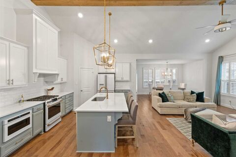 Nestled in the serene Parks of Aledo Point Vista, this stunning Tudor transitional home boasts exceptional curb appeal and a welcoming covered front porch. Beautiful landscaping leads to a striking entry, where luxury hardwood flooring, plantation shutters, and elegant decorative lighting set the tone. The versatile floor plan is perfect for entertaining, with an open-concept kitchen, living, and dining area. The stylish eat-in kitchen is a chef's dream, featuring an oversized island with a breakfast bar, quartz countertops, a spacious pantry, and upgraded appliances and hardware. The living room showcases a gas fireplace with a brick surround, hearth, and mantel, while vaulted ceilings with a trimmed beam add character. The dining room overlooks the fenced backyard with a covered patio, ideal for outdoor enjoyment. The first-floor primary suite is a private retreat, offering a spa-like en-suite bath with double vanities, a large soaking tub, a separate shower, and an expansive walk-in