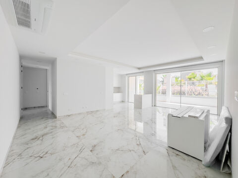 The property has an open-plan living room, dining room and kitchen that extends seamlessly onto a spacious terrace, providing perfect indoor-outdoor living. The layout includes 3 double bedrooms and two large bathrooms, with the master bedroom having an en-suite bathroom. The quality of the finish is excellent, with a beautiful modern design.