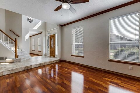 Spacious, updated, and perfectly locatedthis West Creek Estates home offers room to live, work, and entertain. Light-filled formal living and dining areas lead to a warm family room with wood floors and a brick gas fireplace overlooking the backyard. Just off the dining room, a wet bar with granite counters, backsplash, sink, built-in wine fridge, and stained glass windows adds a charming touch for entertaining.The kitchen is beautifully equipped with a large island, breakfast bar, built-in gas range, dual ovens, built-in microwave, extensive counter space, and a pantry with sliding drawersdesigned for both everyday cooking and special gatherings.Upstairs, youll find four generously sized bedrooms including a spacious primary suite with dual walk-in closets, one featuring a custom closet system. The ensuite bath includes granite counters, dual sinks, a Hollywood tub, separate shower with tile surround, and ample cabinetry. Secondary bedrooms all offer ceiling fans, large clo