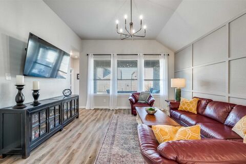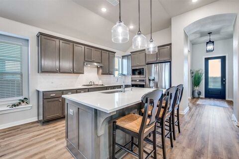 Highland Home feels like NEW! Natural light flows through this 1 story floor plan, connecting the living spaces to a spacious covered patio,perfect for morning coffee or evening gatherings. Luxury vinyl plank flooring enhances all main living areas and hallways. The gourmet kitchen showcases stainless steel appliances, gas cooktop, and built-in microwave and oven, paired with richly stained cabinetry featuring 42 inch uppers with adjustable shelving and pristine white quartz countertops. The breakfast nook flows from kitchen to family room with large walk in pantry laundry area. The spa-inspired primary bath offers a separate shower with upgraded tile surrounds in both the tub and shower. Popular single story home with great floor plan. The 4 the bedroom can be ideal study away from the other bedrooms. Step outside to a spacious covered patio, perfect for refined outdoor living with stone ledge flower beds. Sandbrock Ranch offers incredible amenities with Club house, community pool,