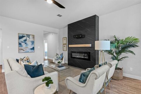 Welcome to the community of Morningstar, you will be greeted by a beautiful lake that terraces down the south side of the neighborhood. You will see home owners fishing, running and biking and enjoying their amenities. There are 2 beautiful pools, basketball courts and playground equipment. The club house is awesome, one of the best master planned communities available in this area. Built by Impression Homes in 2022, this home is like new, impeccable, very lightly lived in and move-in ready. The home is staged so that you can see the livability and open floor plan designed for entertaining and family gathering. A truly unique and beautiful focal point of the living room features a built in electric fireplace resting on a stunning black wall with a TV mount above the fireplace designed by the homeowner and also provides optional additional heat to the room. The house also has an additional larger covered patio area across the back giving you nice space for grilling or relaxing.