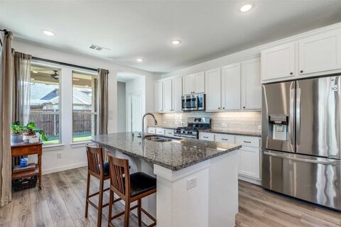 Fantastic find in Sandbrock Ranch. Award-winning Highland Homes built with green features, designer touches and details that make a house a Home. Single story with 3 bedrooms, 2 Full Baths, and plenty of storage. The elegant Master suite with bay windows features a walk-in closet and an oversized walk-in shower with double sink vanity. The split secondary bedrooms share a full bath with a shower-tub combo. The gourmet kitchen features 3 cm granite countertops, gas range, 42 inch cabinets for extra storage, large pantry, and an island for dining and food prep. Live comfortably with a Tankless water heater and Trane 16 seer HVAC with fresh air return connected to the main AC to help reduce dust, odors, and indoor contaminants for improved indoor air quality. Energy star rated exhaust fans in all bathrooms. Enjoy the covered back patio with charmingly landscaped back and side yard areas. Sandbrock Ranch is more than a neighborhood, it's a lifestyle. Residents enjoy year-round eve