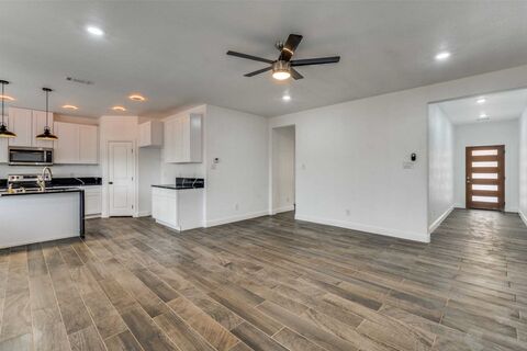 Welcome to your beautifully crafted new home located on a spacious corner lot in Fort Worth. This stunning four bedroom, two bath home blends modern design with everyday comfort. The open concept floor plan connects the living, dining, and kitchen areas, creating an inviting space filled with natural light. The kitchen is a centerpiece of the home featuring a large quartz island, sleek cabinetry, and stainless steel appliances perfect for both everyday meals and entertaining. The split bedroom layout offers privacy with a serene primary suite and three additional bedrooms that can serve as guest rooms, a home office, or flex space. Outside, enjoy an oversized backyard ideal for gatherings, play, or relaxing under the Texas sky. Conveniently located near schools, shopping, and major highways, this home combines contemporary style with the comfort and accessibility you have been searching for.