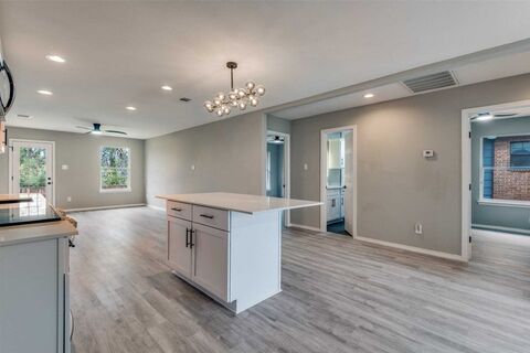 Welcome Home to Comfort, Charm, and Modern LivingStep inside this beautifully refreshed four-bedroom, two-bath haven where every detail shines. Fresh paint and luxury vinyl flooring flow throughout, setting the tone for a home that feels warm, welcoming, and truly move-in ready.The heart of the home is the open-concept kitchen and great room, designed for gathering, cooking, and connecting. The kitchen features white quartz countertops, a large island crowned by a beautiful 14-light chandelier, and generous workspace. Additional thoughtful touchesceiling fan lights, can lighting in the great room, and a smooth layoutcreate a bright, inviting space youll love spending time in.Both bathrooms have been fully updated, showcasing custom tile work, sleek modern finishes, and LED mirrors that elevate the experience with a spa-like feel. The primary suite includes a walk-in closet with custom shelving, offering both style and function.Youll also appreciate the convenience o