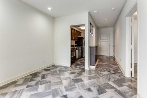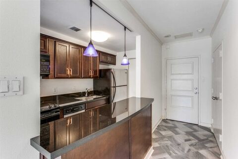 One bedroom, one bath poolside condo at Preston Tower offers economical living in a prime Preston Hollow location. This 2nd-floor Garden Building unit has a beautiful view of the landscaped pool courtyard and firepit. The compact 544 sq. ft. floor plan features a well-appointed galley kitchen with breakfast bar, ample closet space, an office nook in the bedroom, and wall-to-wall windows that open to a private balcony. Easy in & out unit is adjacent to the elevator servicing the basement and a stairwell. Many building upgrades have recently been completed, including a new fire alarm system, roof replacement, and refurbishment of the elevators and common hallways. Preston Tower offers the ultimate low-maintenance lifestyle with amenities such as round-the-clock front desk and basement attendants, fitness center, community room with kitchen and library, pool area with fire pit, basement laundry room, tennis-pickleball court, and a dog park. Various on-site services are located on the buil